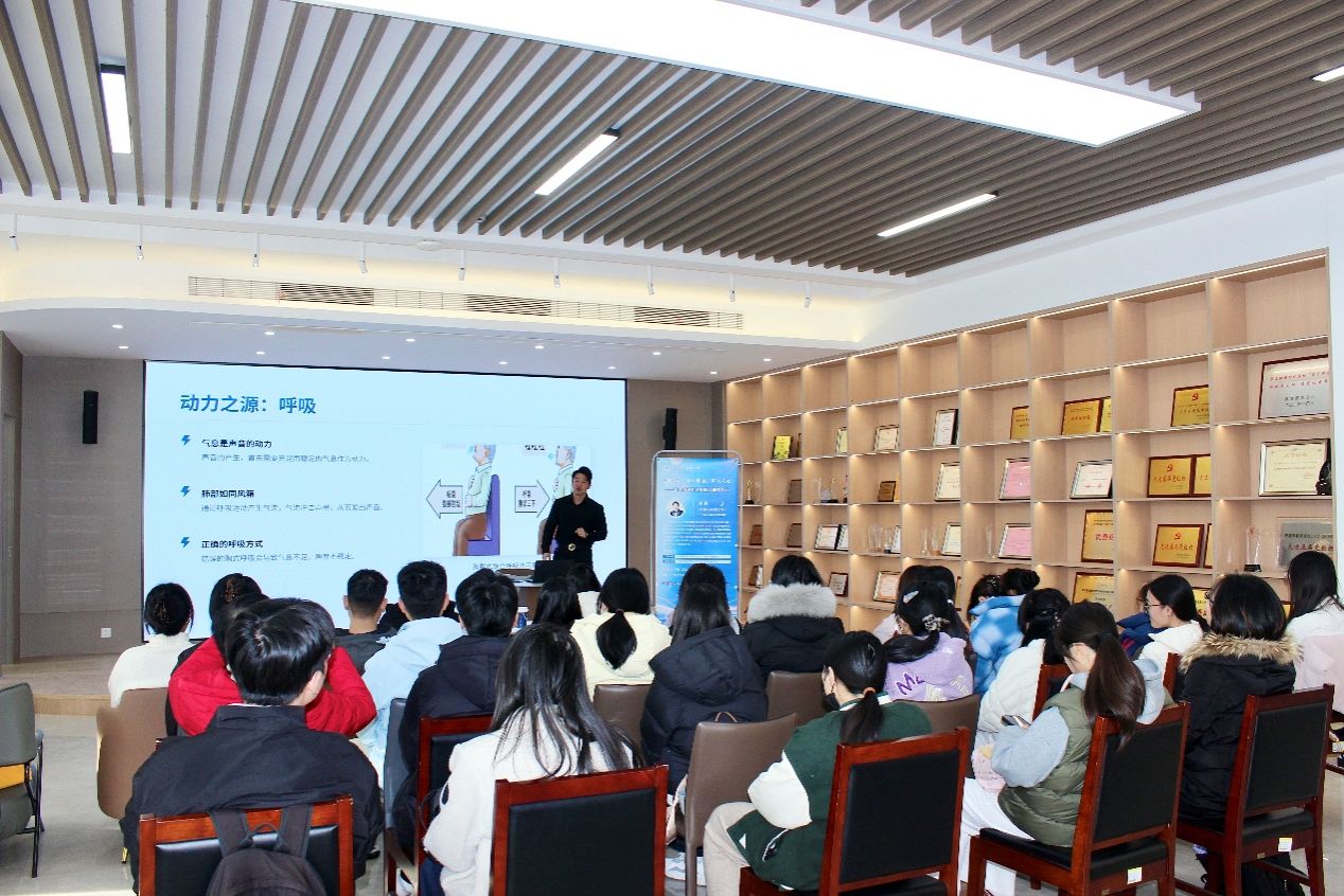 互动环节中,邵老师带领大家进行“哼鸣练习”,从低音“嗡”开始,逐步上行,注重气息均匀与声音连贯。他强调应以气息推动声音,避免喉部紧张,并对常见问题给予个别指导。最后,邵老师提出日常护嗓建议,包括适时饮用温水、避免在嘈杂环境中过度用声,以及通过适时“噤声”缓解声带疲劳。