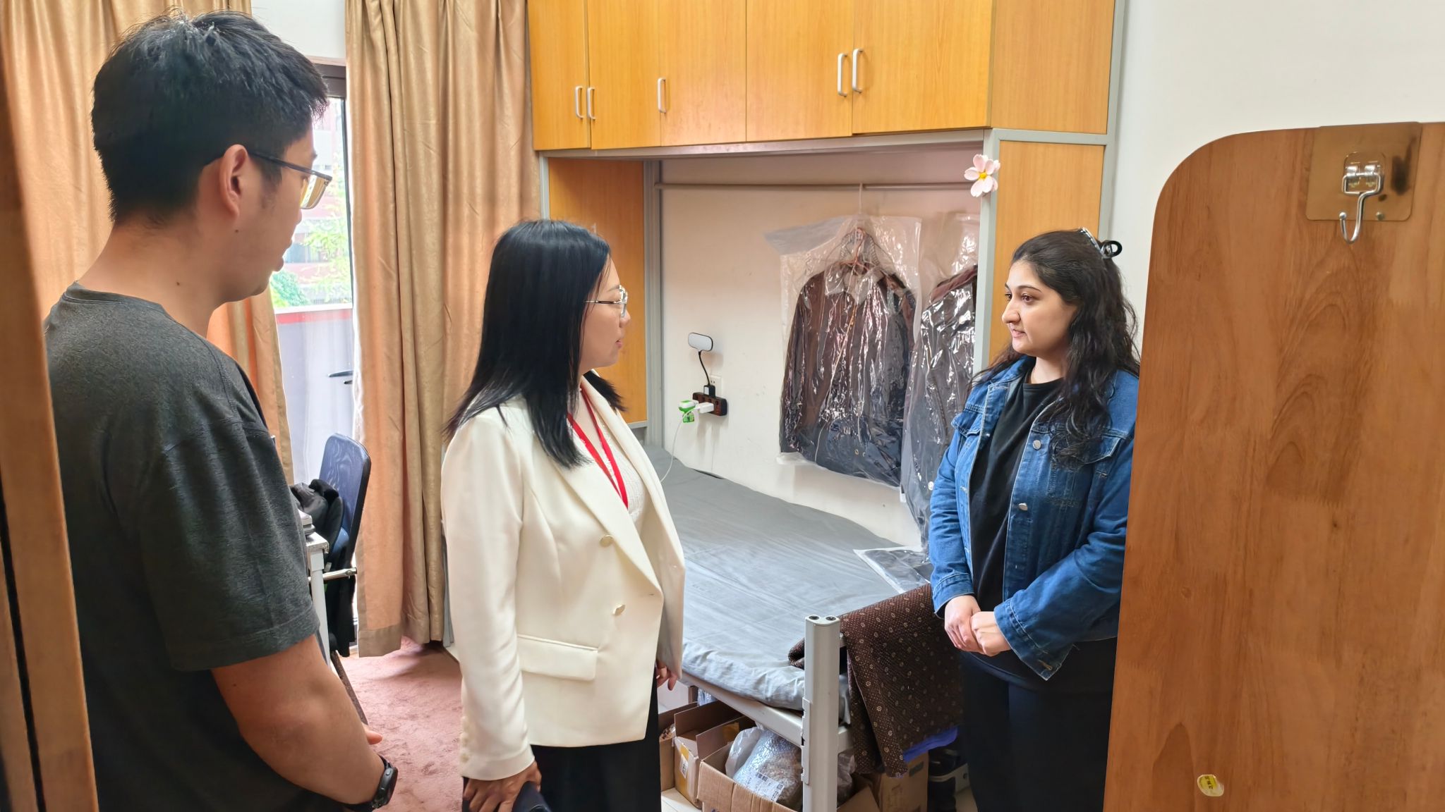 走访中,学院领导深入学生各公寓楼栋,重点排查寝室内是否违规使用违禁电器、饲养宠物、私拉乱接电线、人走不断电等情况,现场进行政策宣贯、立查立改。结合即将到来的五一假期,面对面开展防范网络诈骗、出行交通安全、餐饮安全及网络文明行为教育,强调离校应断电关窗锁门,提前办理好请假手续。